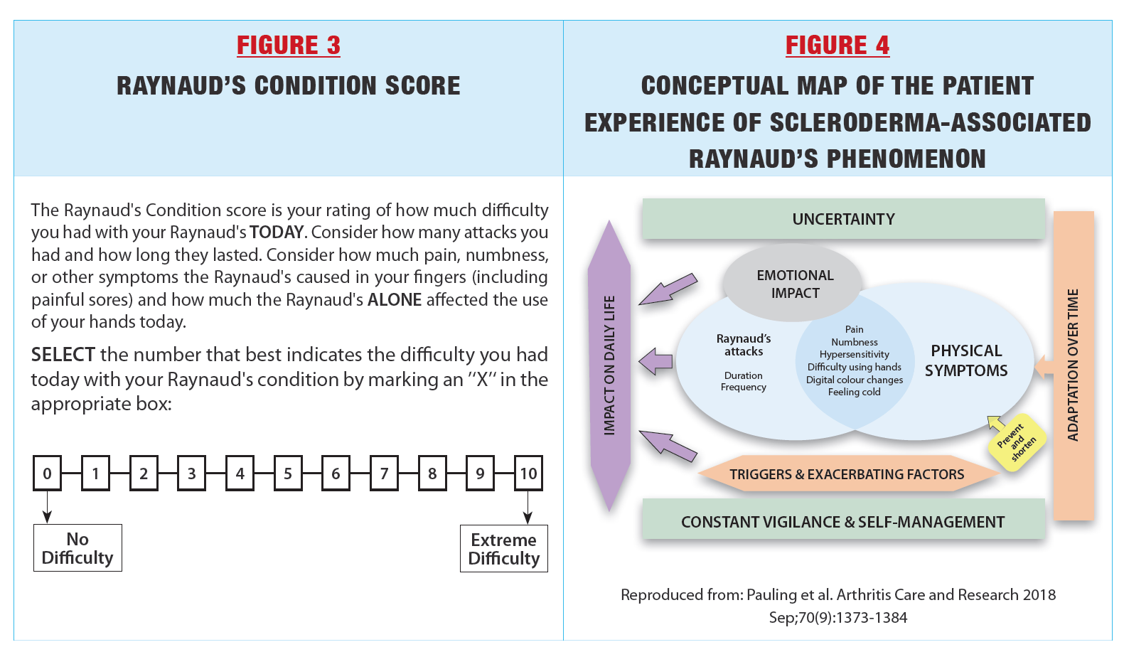 Raynaud’s phenomenon is highly variable and episodic. By its nature, it is one of the symptoms of scleroderma that is best measured by patient reports. In the past, many studies of treatments for Raynaud’s phenomenon used Raynaud’s Condition Score (Figure 3). Patients are asked to rate their Raynaud’s phenomenon from 0–10, taking into account the frequency, duration, pain, numbness, and impact of RP attacks on that day. An average can be taken when the questionnaire is rated on multiple days using a diary. However, several clinical trials of potent vasodilators such as tadalafil, selexipag and bosentan have not shown the expected beneficial results when using Raynaud’s Condition Score, while other PROs such as the HAQ showed improvement. This suggests that the single item Raynaud’s Condition Score does not capture the multifaceted experience of Raynaud’s phenomenon. |