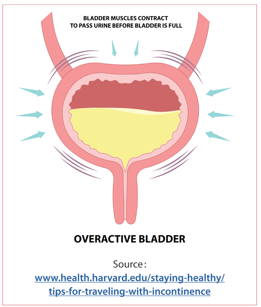 URGENCY URINARY INCONTINENCEUrgency urinary incontinence is associated with a sudden, compelling urge to urinate (Haylen et al., 2010), with urine leakage occurring while the person is on their way to the toilet. This phenomenon is explained by impaired bladder compliance. Under normal conditions, the bladder can increase in volume (fill) without its internal pressure increasing proportionally (sensation of urge). However, scleroderma can cause bladder fibrosis, which decreases compliance and creates sudden, intense urges that result in urinary incontinence. One study reports that 67% of people living with scleroderma experience urgent urinary urges that may lead to urgency urinary incontinence (Pacini et al., 2020). People who experience this type of incontinence are often able to identify triggering factors such as cold feet, running water, putting the key in the door, arriving at the bathroom/toilet, etc.