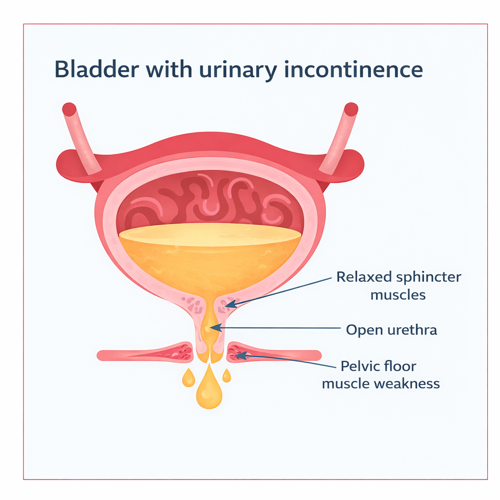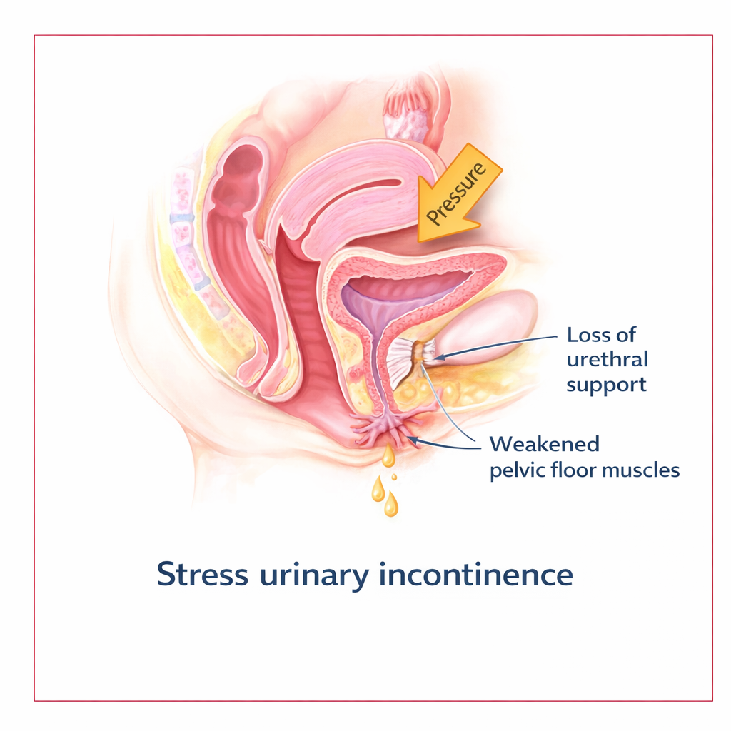 Stress urinary incontinence occurs during physical activity or an action that increases pressure in the abdomen. This pressure pushes on the bladder and increases its internal pressure. When pressure in the bladder exceeds the urethral closing pressure (the tube leading out of the bladder), urine is propelled into the urethra, resulting in stress urinary incontinence. Coughing, sneezing, lifting loads, running, and jumping are just a few examples of factors that can cause stress urinary incontinence.